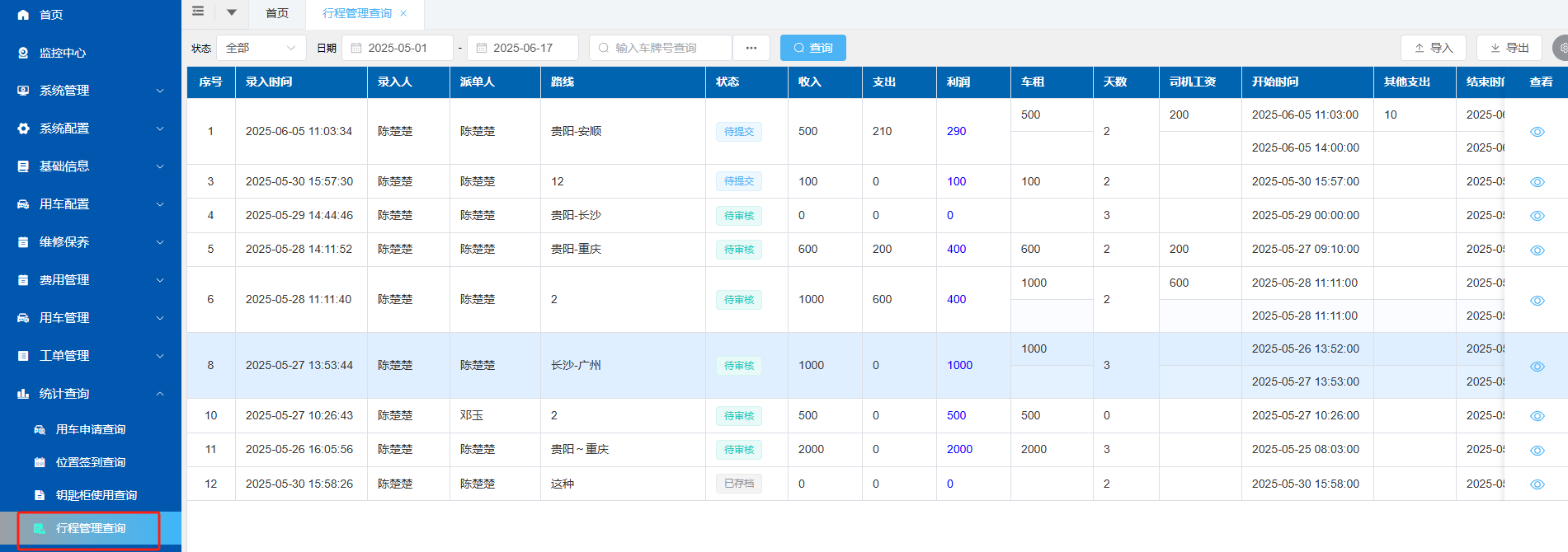 【行程管理查询】中可查看行程明细,并可核算一次行程的收入、支出、利润情况。