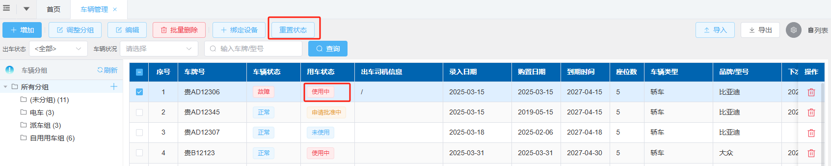 如车辆遇到无法收车、还车的情况,但车辆状态又在使用中,导致流程中无法选择车辆,可选中此车辆,点击上方的“重置状态”按钮重置车辆状态,此功能仅限于车辆状态在“使用中”时操作。