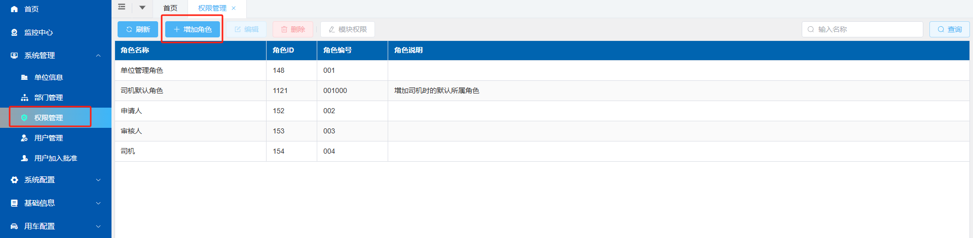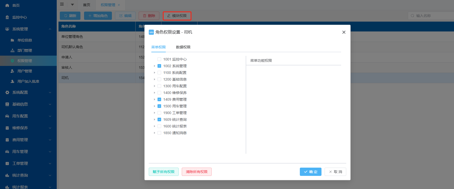 2、选中当前角色,点击上方“模块权限”按钮,分配所属角色菜单权限(),点击“菜单权限”勾选此角色所需要看到并可使用的菜单。注意:车辆管理、司机管理、跟车员管理、油卡管理、往来单位设有“增删改”权限,需要点击左侧菜单名称之后,右侧才展示菜单功能权限,请根据实际情况对角色设置“增删改”权限,“增删改”权限勾选上之后,代表此角色登录系统后,拥有增加、删除、修改车辆、司机等信息权限,不勾选则表示只能查看不能操作;