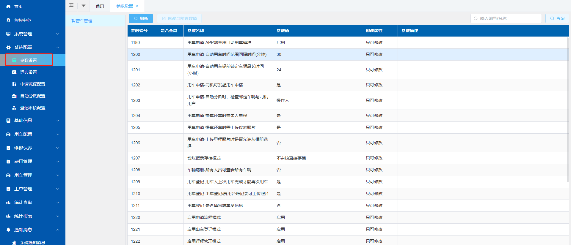 管理员点击左侧菜单中的【参数设置】进入页面,可设置“用车申请模式-司机可发起用车申请”、“ 用车申请模式-提车还车时需录入里程”、“用车登记-是否填写跟车员信息”以及GPS设备提醒等参数,可根据单位实际情况进行设置。