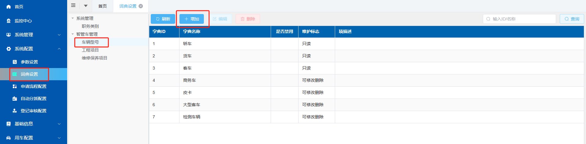 管理员点击左侧菜单中的【字典设置】进入页面,可增加单位职务类别、车辆型号、工程项目、维修保养项目字典,增加后可在车辆管理、用车登记和维保信息中被选择。比如在“车辆型号”中增加“房车”类型,在【车辆管理】中新增车辆时,车辆类型一项便可选择“房车”类型。