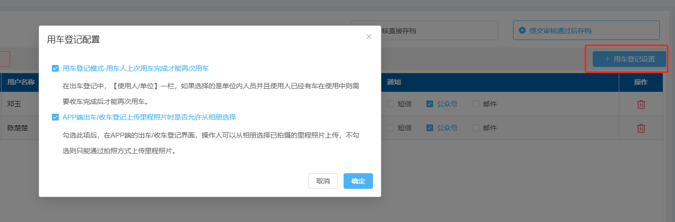 “用车登记配置”中管理员可设置“用车登记模式-用车人上次用车完成才能再次用车”、“APP端出车登记/费用台账记录可选择照片上传”,请根据单位实际情况进行设置。