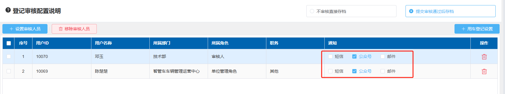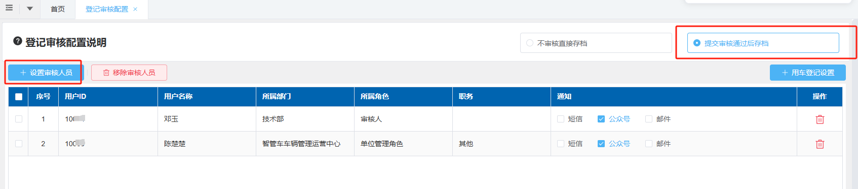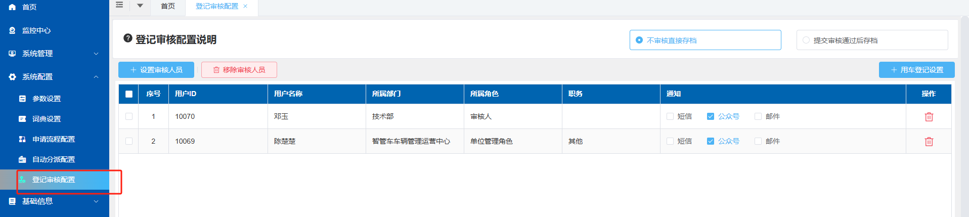 【登记审核配置】中可配置行程管理、维保登记、费用登记、请假登记审核人员,平台提供了“不审核直接存档”、“提交审核通过后存档”两种模式,管理员可根据实际情况进行设置。