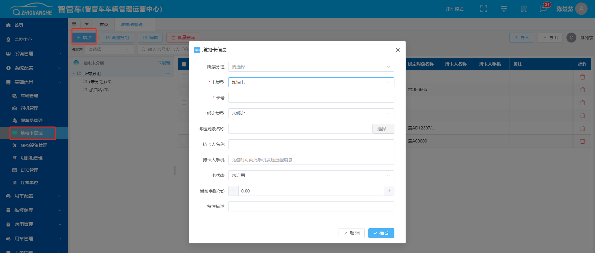 根据单位实际情况,如有油卡并需要管理则录入。录入后方便费用管理(若油卡已在加油站充值余额可在“当前余额”中输入油卡真实余额,用户在加油登记中选择相应加油卡时会扣减相应余额)。
