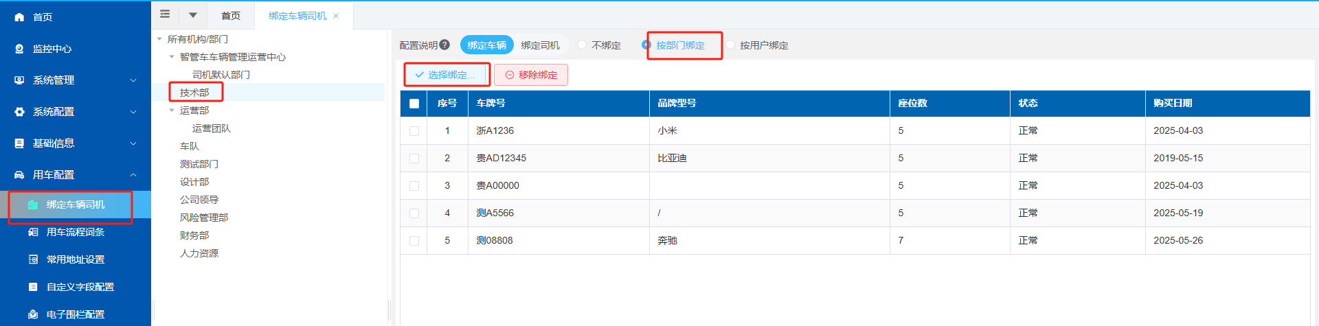 选择启用此功能后,登录部门用户/用户在用车审核、行程管理、出车登记、收车登记、维保费用界面选择车辆与司机时,只能选择绑定的车辆和司机进行操作。可按部门绑定或按用户绑定。启用此功能后,需要使用车辆的部门或用户均需要进行绑定操作,如未绑定,则在选择用车时无法查到未绑定部门可操作的车辆与司机。