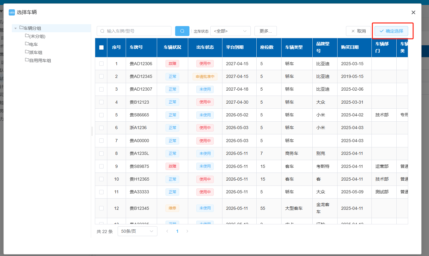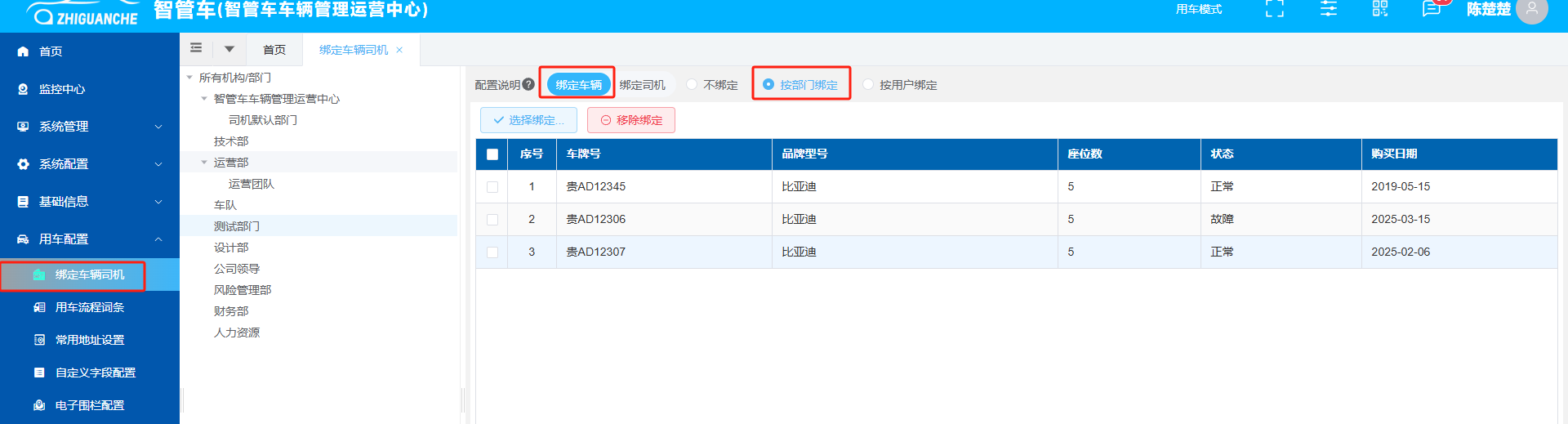 点击左侧菜单中的【绑定车辆与司机进入界面,选择“绑定车辆”并勾选“按部门绑定”按钮,左侧选择部门,点击“选择绑定”按钮,在弹出框中选择部门需要绑定的车辆返回界面即可;