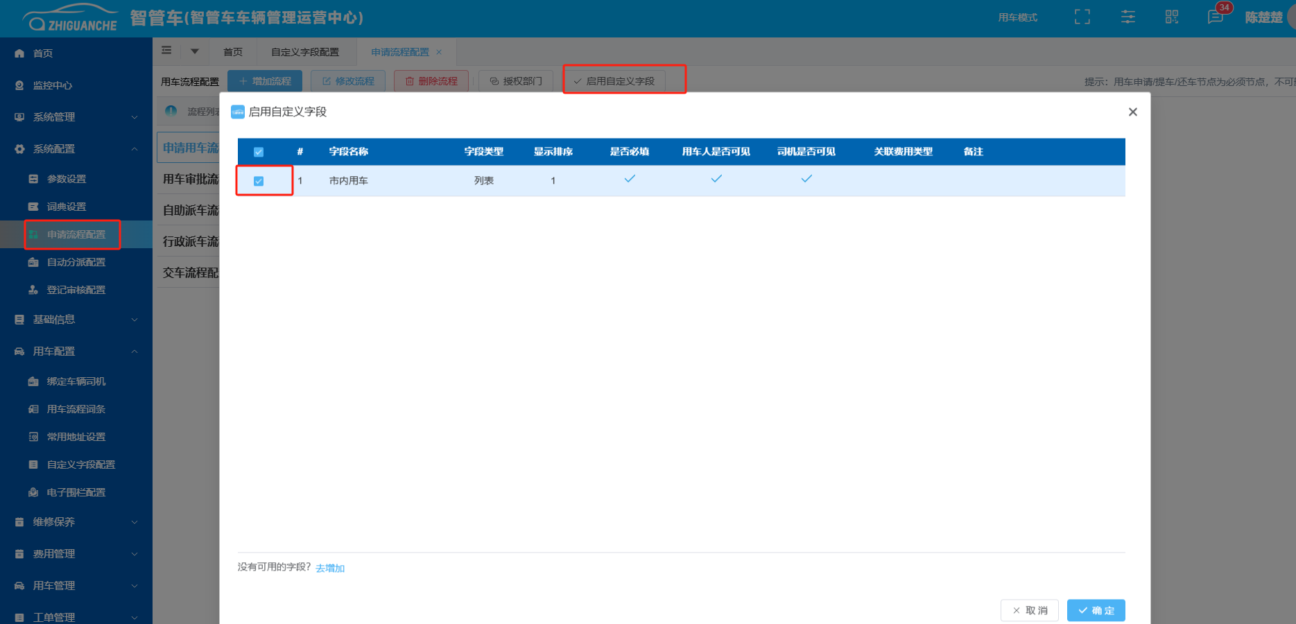 3、自定义字段增加后,需要在【流程配置】-选择左侧流程,点击上方的“选择自定义字段”并勾选需要在流程中展示的字段,点击“确定”,在用车申请流程中便可以展示这些字段了。