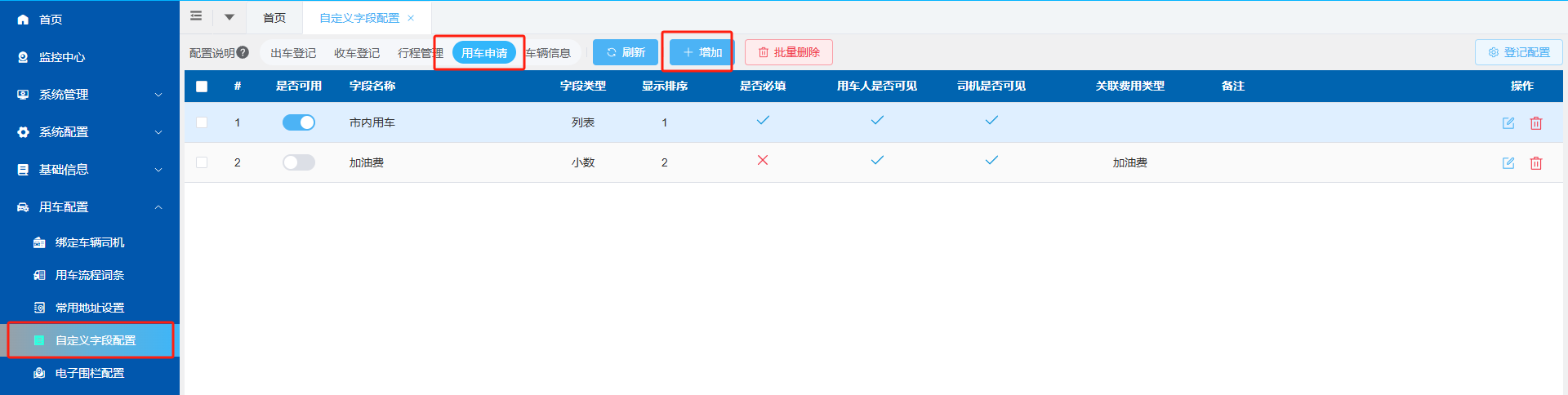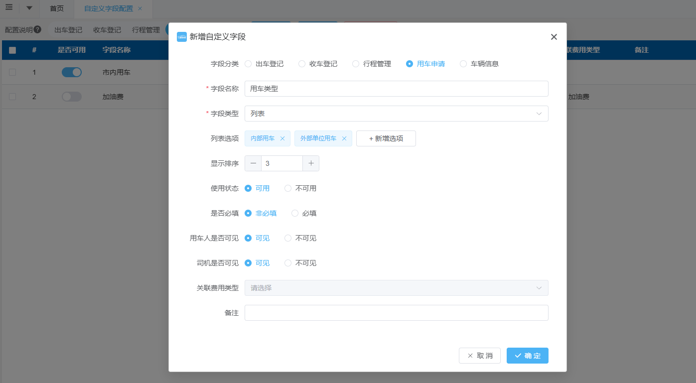 1、左侧菜单栏点击【用车配置】中的【用车自定义字段】菜单进入页面,选中需要增加自定义字段的类型,如需要在用车申请中增加自定义自段,可选择“用车申请”,点击“增加”按钮,在弹出框中输入字段名称,选择字段类型,显示排序位置以及配置使用状态、是否必填、用车人是否可见、司机是否可见等内容;