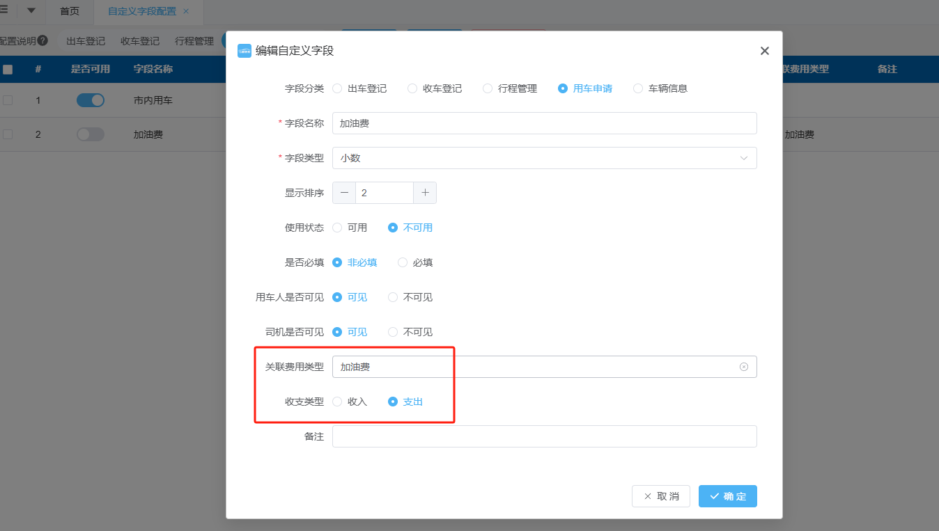 2、注意如选择的“字段类型”为整数或小数,则需要在“关联费用类型”中选择需要被关联的费用类型,并设置收支类型,以便在报表管理中更准确的统计费用。