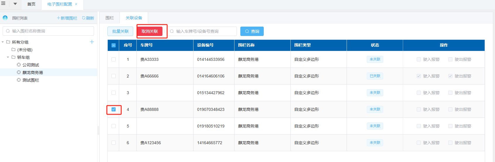 “关联设备”,在关联围栏中选中车辆,点击“取消关联”按钮即可。