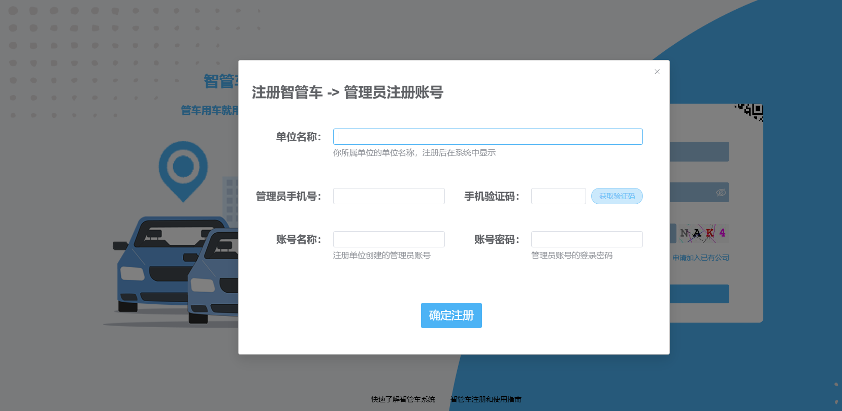 2、依次填写单位名称、管理员手机号、帐号名称、帐号密码,输入手机验证点击“确定注册”。