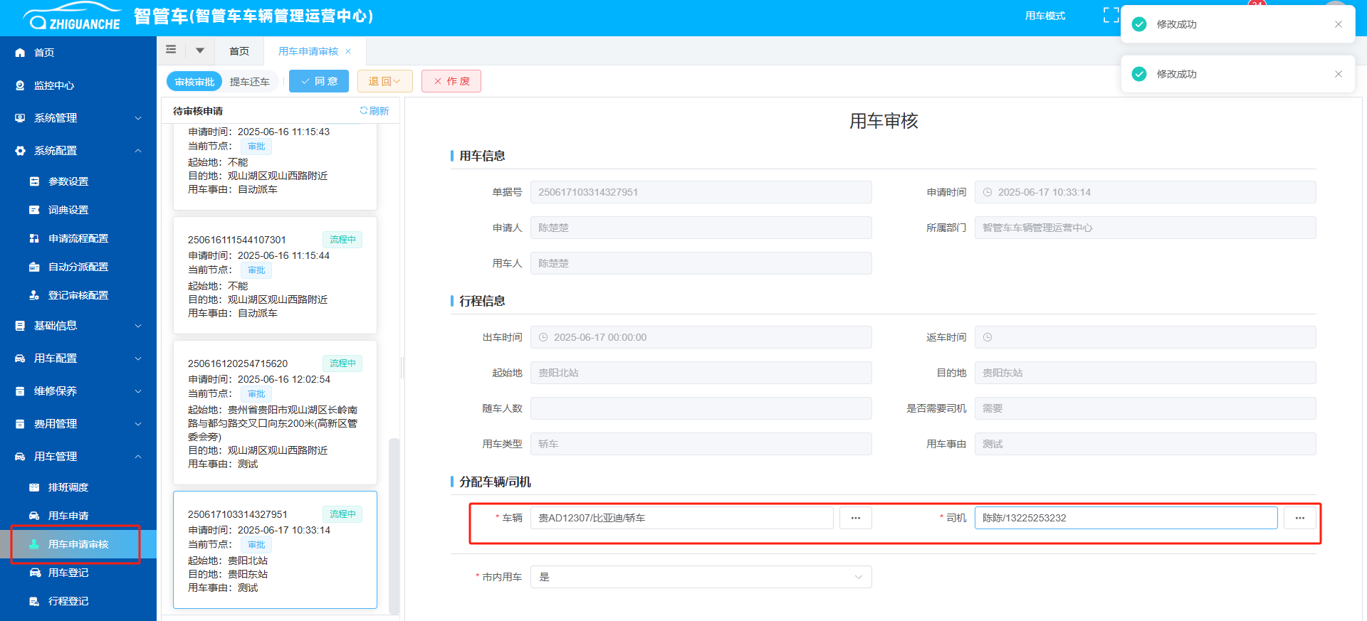 有审核权限的人员登录系统,左侧菜单栏选择【用车管理】-【用车审核审批】菜单进入页面,选择“审核审批”类型,在待审核申请列表中能查询到申请人提交的用车申请,如有分配司机车辆权限,审核人员可在“分配车辆/司机”中分配车辆与司机,再勾选用车申请,点击上方“同意”按钮进行审核;