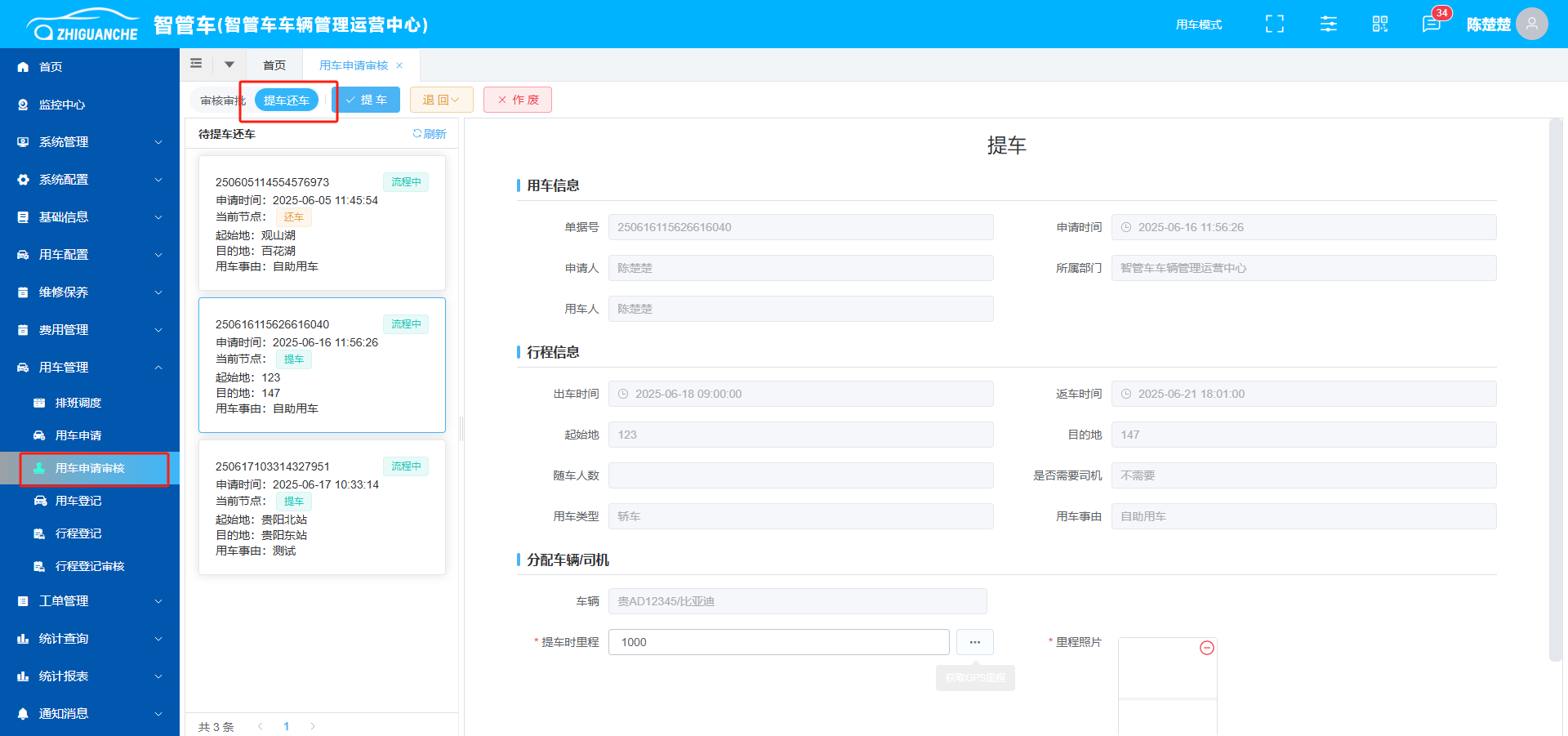 有提车还车权限的人员登录系统,左侧菜单栏选择【用车管理】-【用车审核审批】菜单进入页面,选择“提车还车”类型,在待提车还车列表能查询到需要进行提车还车的记录,点击上方“提车”按钮进行提车操作(提车还车如需录入里程,单位管理员可在【系统设置】-【参数设置】中先配置好)。