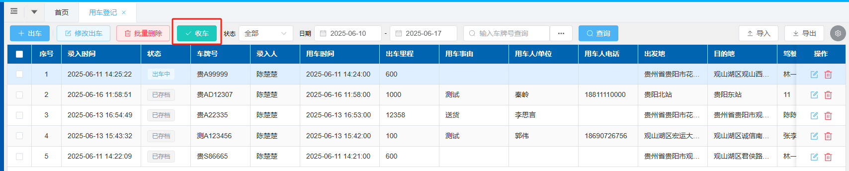 2、车辆回到单位或指定地点后,收车时点击【收车】填写收车时间、里程数后确定,车辆状态变为“已收车”,如确认信息无误后点击【存档】,则此条记录状态为“已存档”,并且车辆状态还原为“未出车”,此车可再次进行【出车】操作。