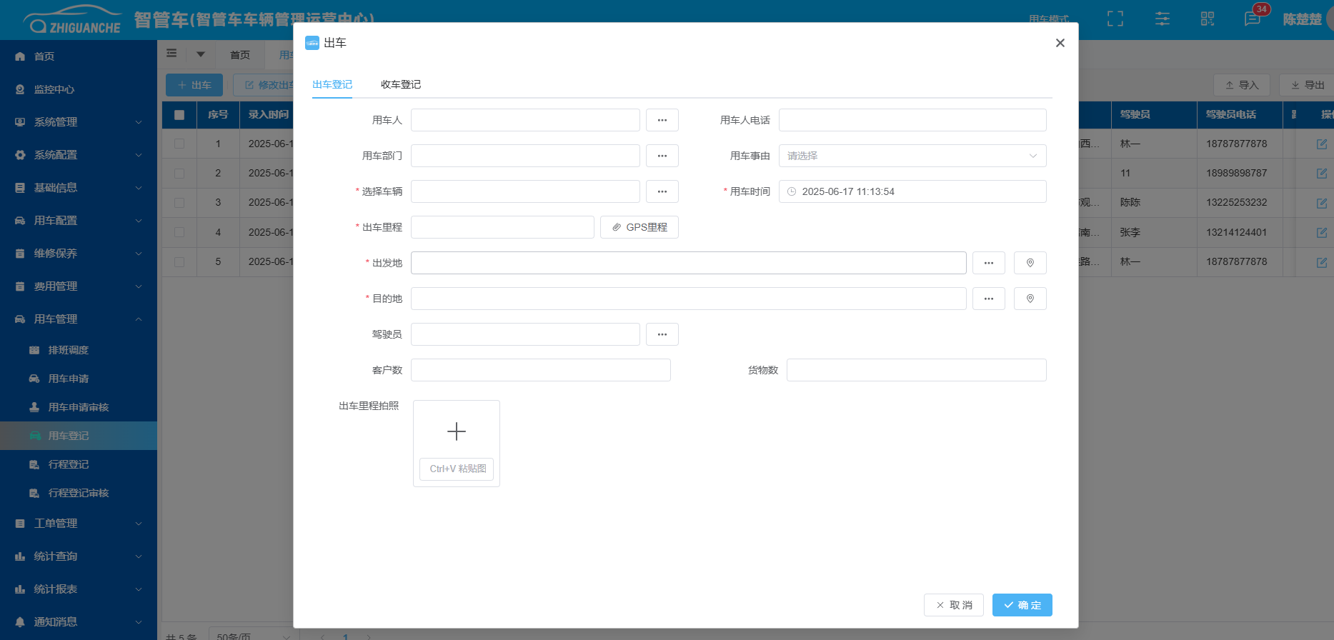 1、左侧菜单栏选择【用车管理】-【用车登记】菜单进入页面,点击上方的【出车】按钮,在登记界面选择车辆、用车时间、用车人、出车里程等信息点击“确定”,则车辆状态为“出车中”,若信息有误可点击“修改”,录入错误的信息可选择“批量删除”后重新申请;