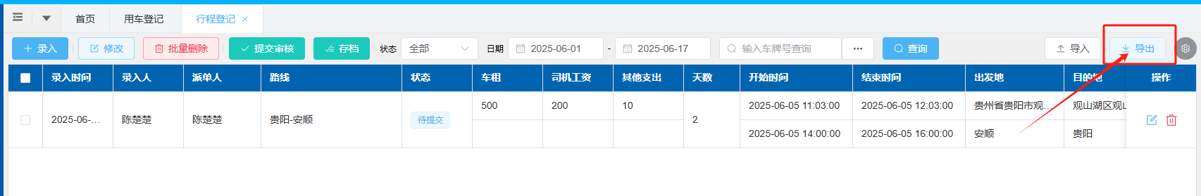 如需要导出行程记录,可勾选需要导出的数据,点击上方的“导出”按钮进行导出。
