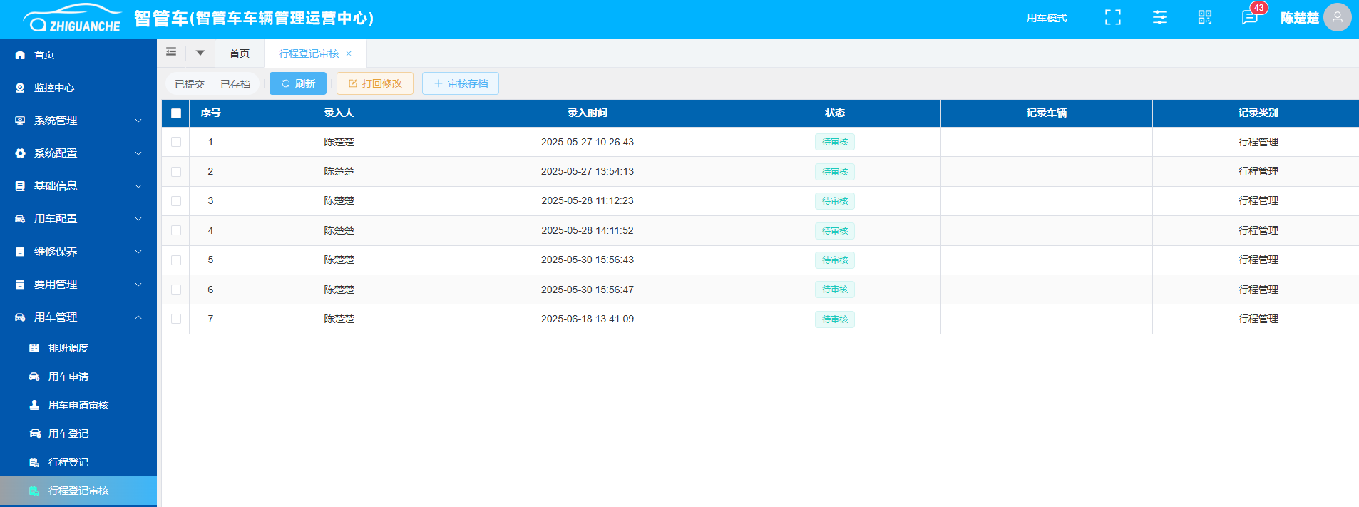 【登记审核配置】中配置了“提交审核通过后存档”,有审核权限的人员可在【行程登记审核】中查询提交行程登记申请并进行审核存档操作。