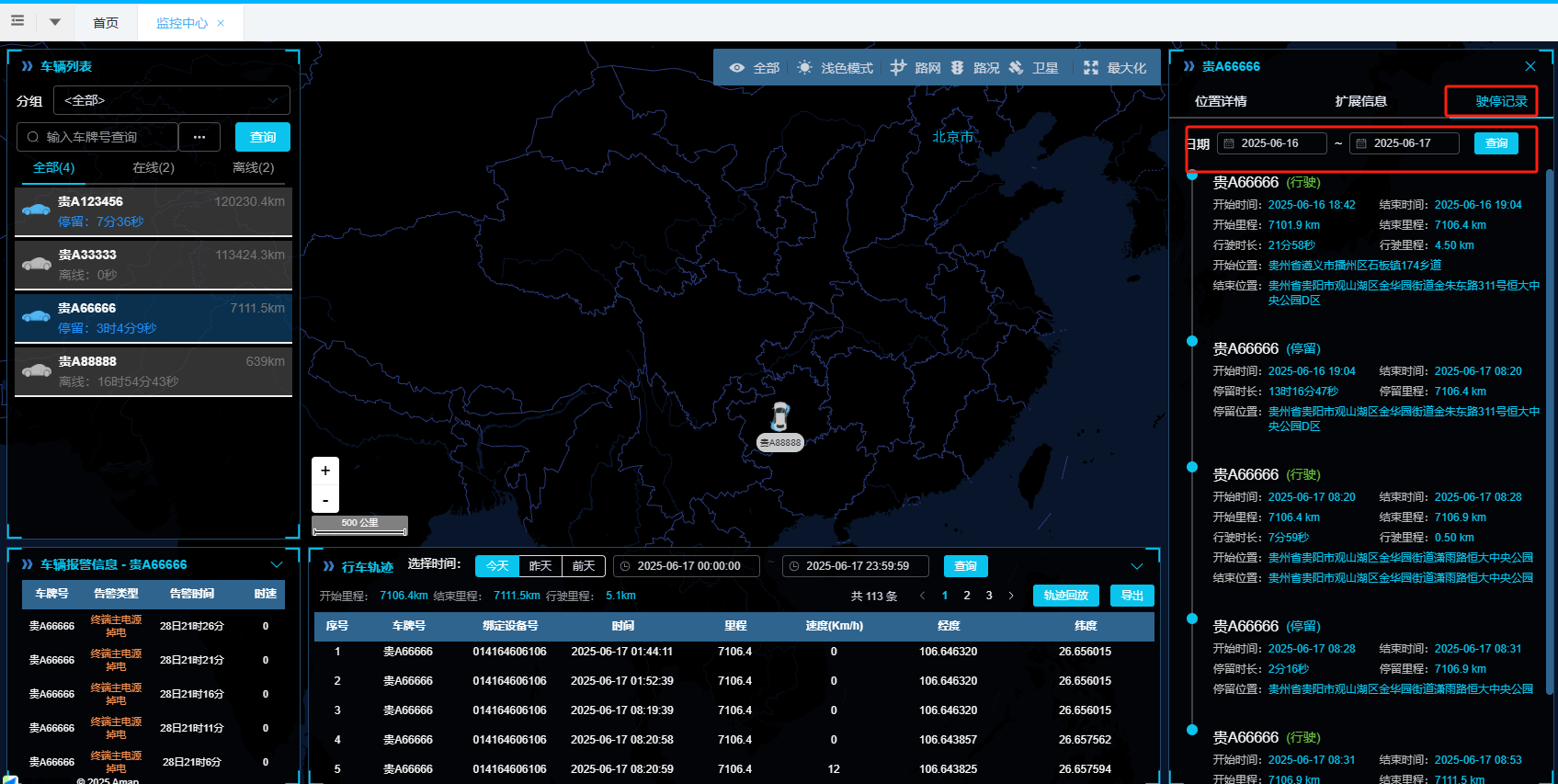 驶停记录可按日期查询所选择车辆的行驶停留信息,包括开始时间、结束时间、里程、停留时长、开始位置和结束位置。