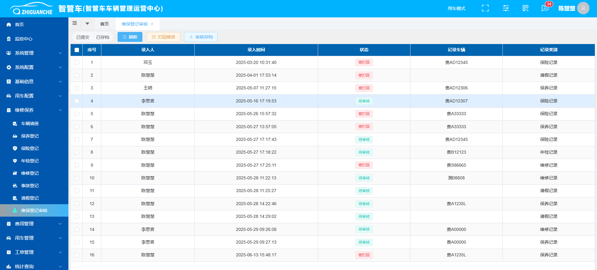 有审核权限的部门领导或管理员可在【维保登记审核】查看员工提交的维保申请,并可在此进行审核存档和打回修改的操作。