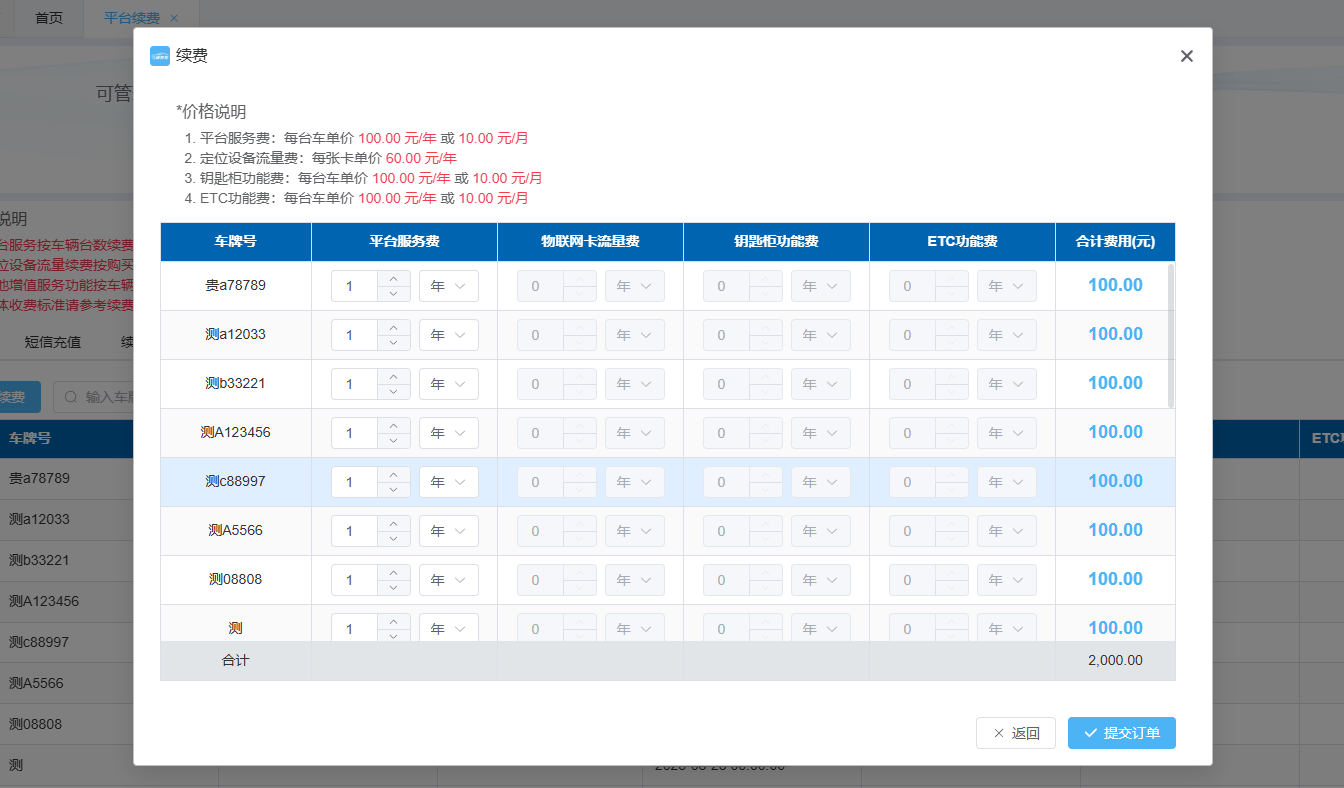 在弹出框中,对需要续费的项目进行续费,平台服务费、钥匙柜功能费ETC功能费可选择年或月进行续费,流量费由运营商收取,只能按年续费,核对续费详情,确认无误后点击下方的“提交订单”按钮;