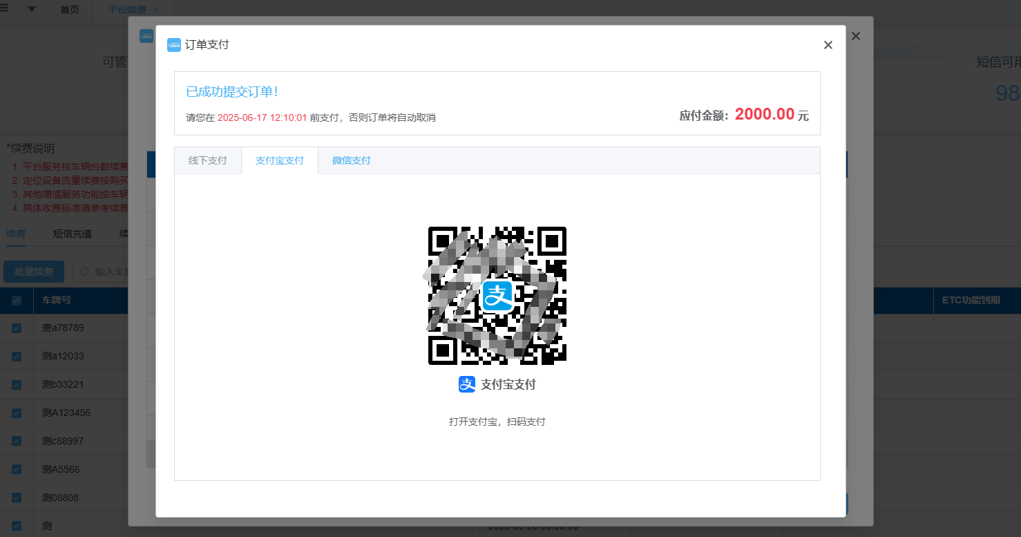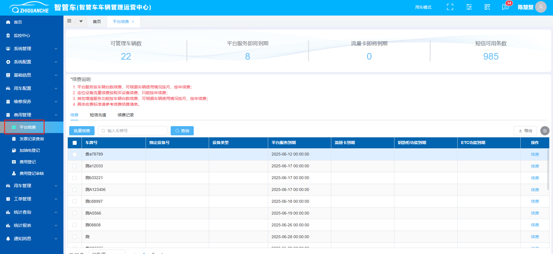 续费管理中提供了平台服务续费功能,点击“续费”页签。选择即将到期或已到期的车辆,点击上方的“批量续费”按钮;