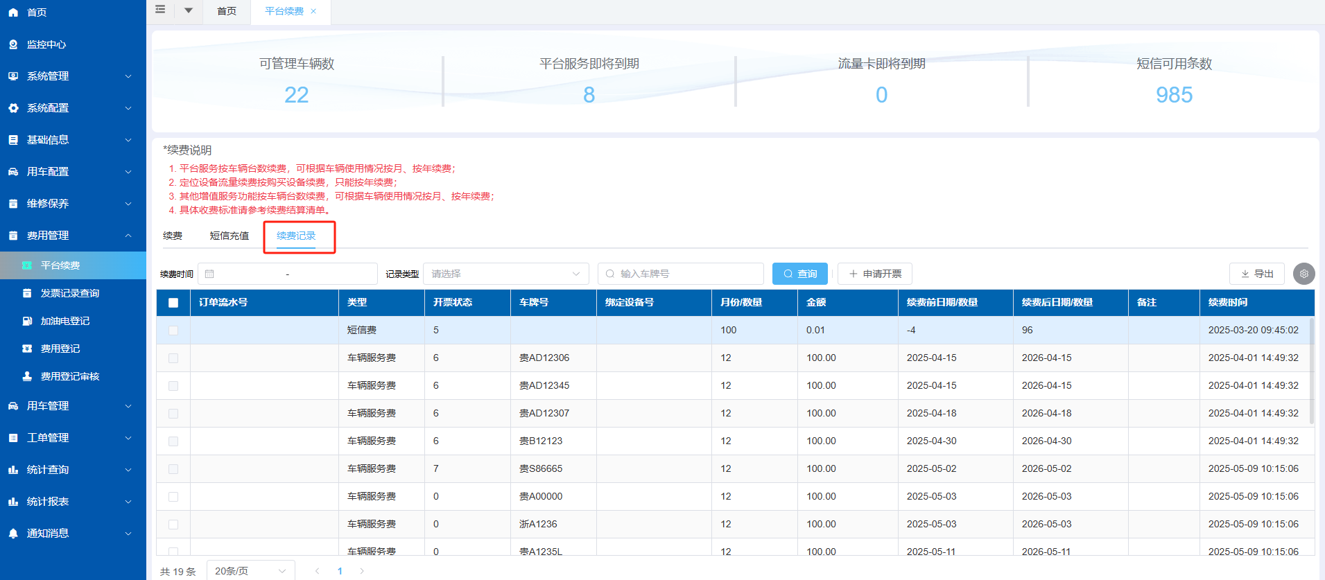 续费记录中可查看充值流水详情,提供帐单导出功能。