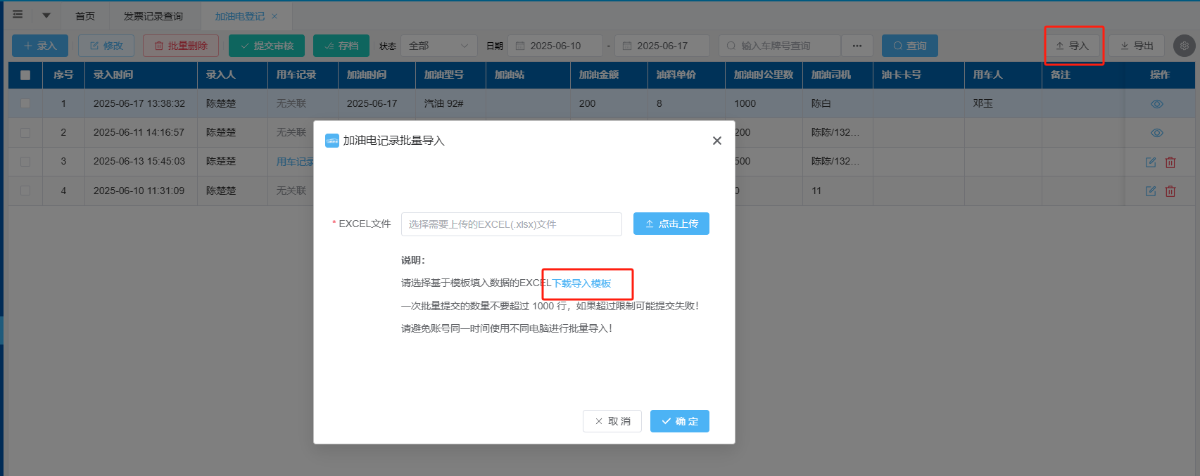 4、如需要批量录入加油记录,可以选择下载导入模板填写加油信息并点击“导入”按钮,上传导入模板导入。