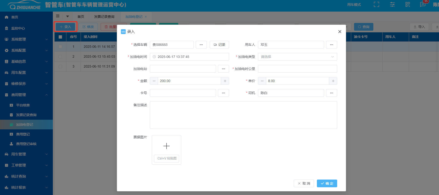 加油电登记为日常管理中重要且为常用操作,在所有费用记录中单独列出并单独统计加油费用,可录入加油费与充电费。