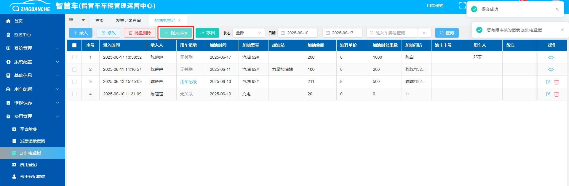 2、在列表界面选中指定加油记录后“提交审核”或“存档”,存档后数据汇总到费用统计中