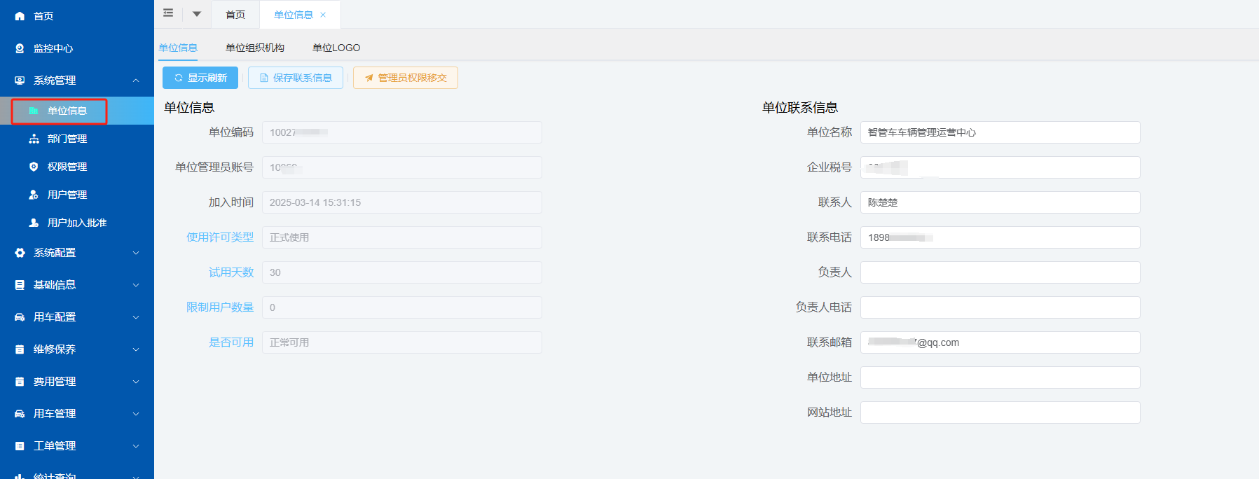 登录帐号后,点击左侧菜单【系统管理】-【单位管理】先完善单位联系信息、单位名称、税号等信息,单位信息填写完整,将在后续平台续费后索取发票中使用。在单位LOGO中可上传单位LOGO,上传后在系统左上角展示。