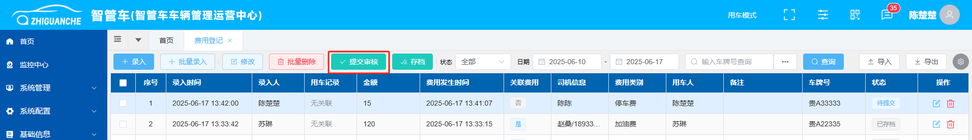 2、费用添加完比后,可在列表界面选中指定记录后可“提交审核”或“存档”,存档后数据汇总到费用统计中。