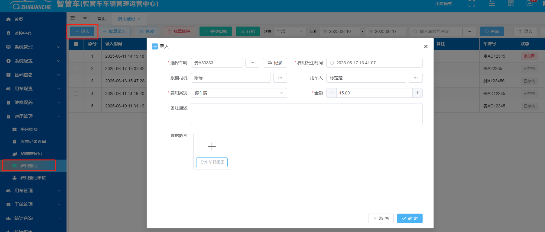 【费用登记】中可记录与车辆相关的各类费用,支持批量录入费用。