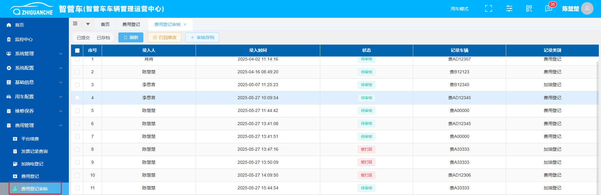 有审核权限的部门领导或管理员可在【费用登记审核】查看员工提交的费用申请,并可在此进行审核存档和打回修改的操作。
