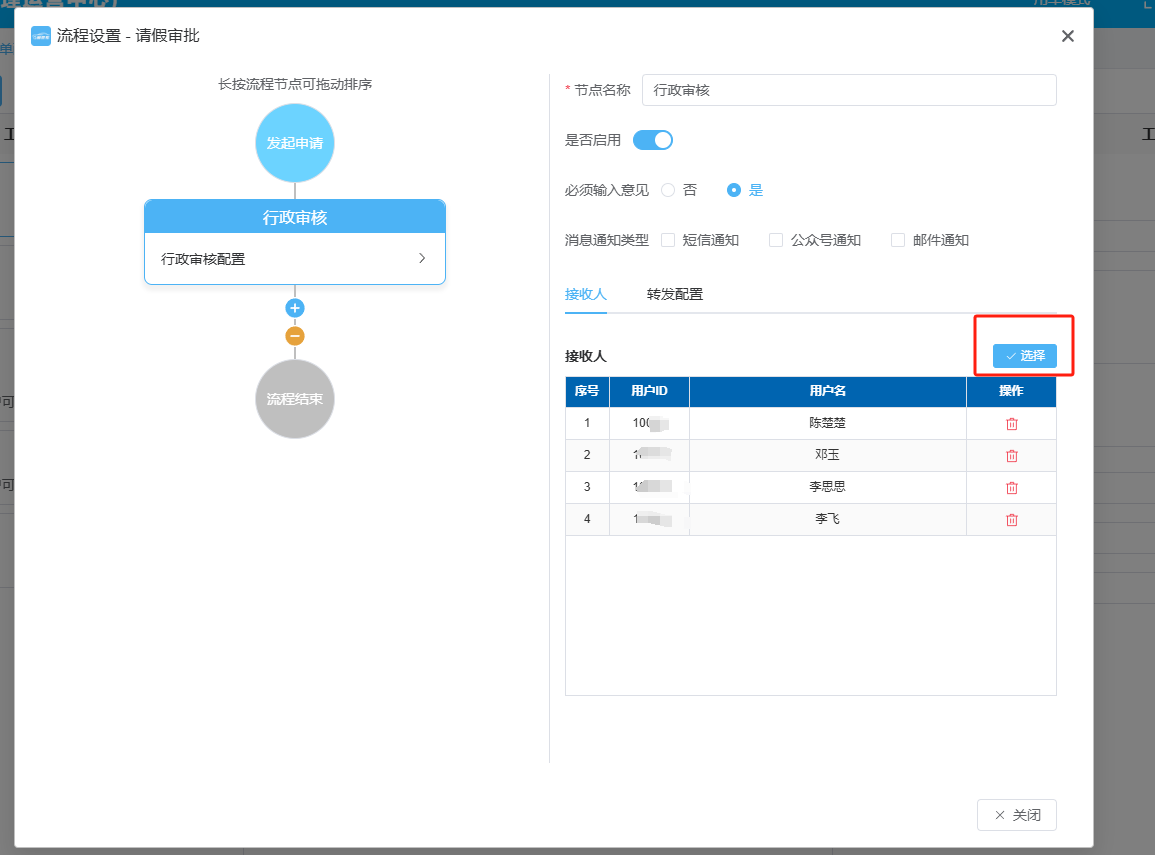 4、点击“点击添加”按钮增加流程,点击“+”号可增加多个审批流程,然后在右侧节点名称输入名称、选择是否启用节点、配置审核人员。