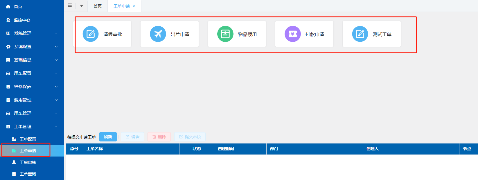 【工单申请】中可查看已配置好并启用的工单,并可点击相应的工单发起申请。
