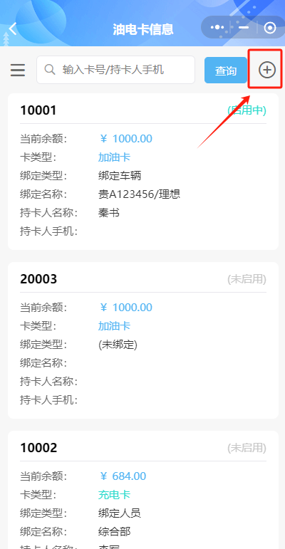 点击首页底部菜单栏【车助手】选择【油卡信息】界面点击右上角“+”号,添加油卡 或电卡,如油卡有分组可先在电脑端油卡管理中创建分组,再依次填写油卡类型、油卡卡号、绑定类型等信息,油卡状态要设置为“启用中”才可在费用录入时进行选择。