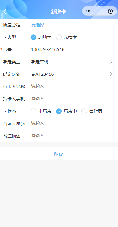 根据单位实际情况,如有油卡和充电卡需要管理则录入。录入后方便费用管理(若油卡已在加油站充值余额可在“当前余额”中输入油卡真实余额,用户在加油登记中选择相应加 油卡时,会扣减油卡余额。