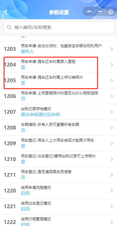 提车还车时需录入里程:如需要在提车/还车中录入里程和里程仪表信息,管理员可在车助手【系统配置】-【参数配置】-“用车申请-提车还车时需录入里程”设置为“是”,则在提车还车节点需要录入里程和上传里程图片。