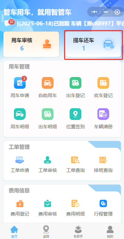 管理员审核后由司机/用车人/申请人或指定人进行提车与还车操作,点击首页【提车还车】菜单进入页面进行提车/还车,点击下方“提车”、“还车”操作按钮即可完成提车/还车操作,