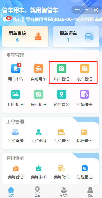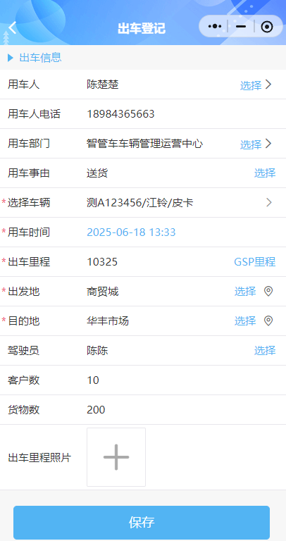 对车辆的使用进行登记,出车登记->收车登记->记录存档。在主界面【出车登记】【收车登记】中依次填写车牌号、日期、事由、用车人、出车里程等信息点击“出车“(如需要添加出车自定义字段可在电脑端可在电脑端【用车配置】- 【用车自定义字段】中添加)。
