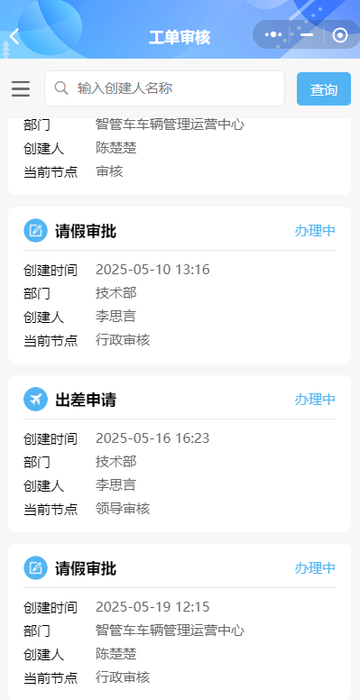 有审核权限的人员,可在【工单审核】中查看需要审核的工单,点击审核列表中的工单,可跳转到详情页,可操作