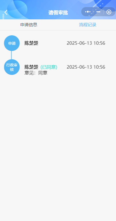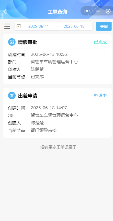 管理人员可在【工单查询】中查历史全部工单信息,其他人只能查看自己申请的工单,可通过工单状态、日期快速查询,点击流程记录可查询审批情况。