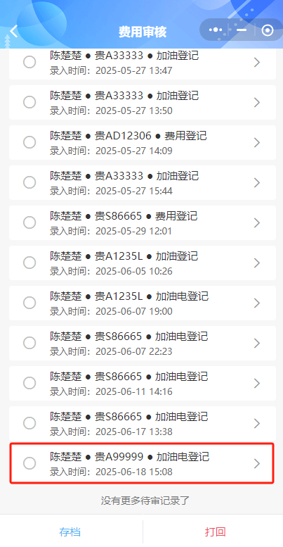 有审核权限的人员从首页点击【费用审核】进入页面,可以查看员工提交的费用信息,可操作“存档”或“打回”,点击费用登记可查看费用明细,“打回”后费用填写人员需回到【费用登记】页面再次核实填写的费用内容,确认无误后再次提交。
