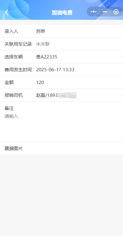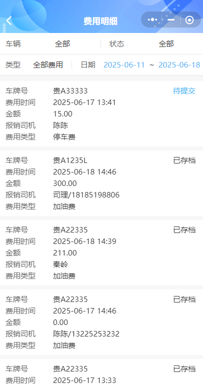 从首页点击【费用明细】进入页面,可以按类型、筛选车辆、筛选日期查看全部费用信息。