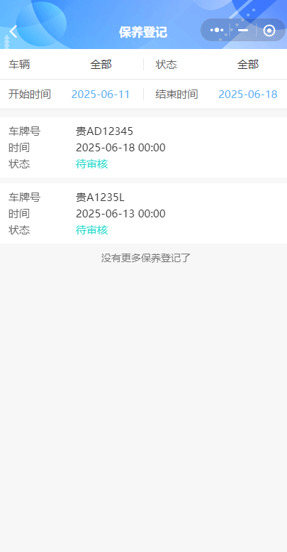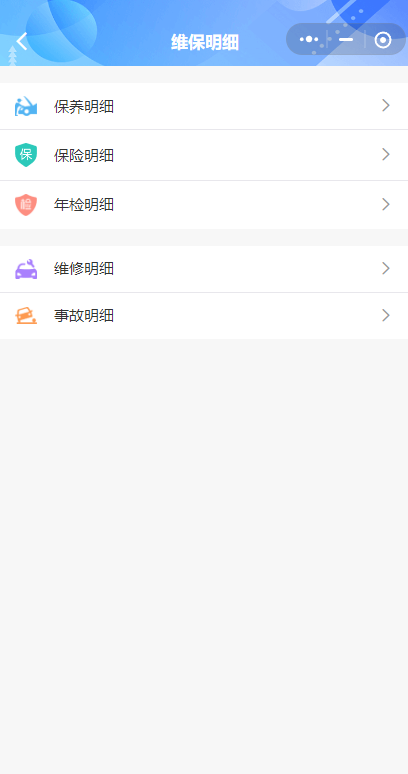 从首页点击【维保明细】进入页面,可以按维保类型、筛选车辆、筛选日期查看维保明细信息。