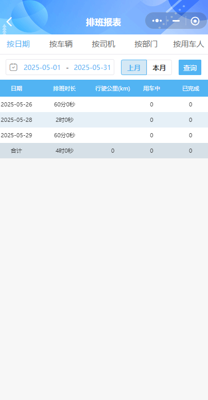 从首页点击【排班报表】进入页面,可按日期、按车辆、按司机、按部门、按用车人查询上月、本月或指定日期排班情况。
