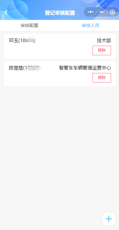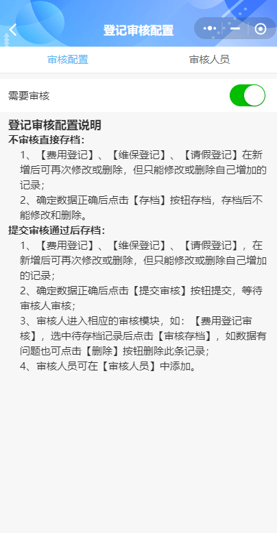 从车助手点击【登记审核配置】进入页面,可在此设置行程管理、维保登记、费用记录、请假登记是否需要审核,如需要审核则打开“需要审核”按钮,并在审核人员列表中点击右下角“+”号设置审核人员,如不需要审核则关闭此按钮。不需要审核的情况下,单位用户操作行程登记、维保登记、费用记录、请假登记时可自己进行存档操作,设置“需要审核”,则增加行程登记、维保登记、费用记录、请假登记时,单位用户操作时需要提交审核,由审核人员审核通过后方可存档。